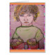 um menino tocando bongos de brinquedo de um desenho colorido de lápis.