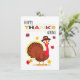 Um cartão de saudação colorido com texto elegante de tipografia "Ação de Graças", e um peru bonito com algumas folhas de outono. O cartão contém uma mensagem de boas-vindas maravilhosa no verso, que pode ser personalizada.
