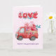 Cartão de dia de os namorados com um carrinho vermelho de água. Corações de carregando e flores no fundo. Eu te amo, escrito do lado. Impressionante e adorável. Rosa claro de fundo padronizado.