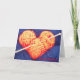 cartão com uma fotografia bonita de um coração feito de lãs alaranjadas em um fundo azul brilhante. Eu perfurei uma agulha de confecção de malhas através dela gosto de uma seta através do coração! Um design muito gráfico que seja uma tomada bonito e subtil no amor e romance!