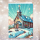 Bonito cartão de Natal personalizado. Fundo rosa e lacrimogêneo com flocos de neve brancos e faíscas rodeiam uma igreja bonito com janelas de vidro manchadas.