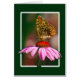 Este cartão apresenta a imagem de uma borboleta dourada sobre uma flor de coneflower roxa.