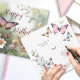 Espessura de 18 pt / Gramatura de 120 lb. Branco suave, textura delicada.