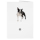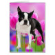 Boston Terrier preto e branco sobre um fundo de tulipas cor-de-rosa.