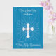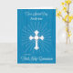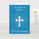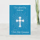 Uma cruz com raios brancos tem um hospedeiro no centro. O fundo de madeira azul faz o branco se destacar. Personalize com o nome do rapaz para um cartão pessoal e guarde o Primeiro Comunicado.