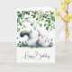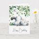 Um gato branco fofo está brincando deitado nas costas, chegando a um galho com folhas verdes onde um pássaro pequeno é criado para o aniversário. Todo o texto pode ser alterado.