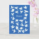 Um cartão para o Passover, com pombas brancas em um fundo azul, e a palavra "paz" na capa. O cumprimento interno, de que você pode mudar ou suprimir, é "Passover feliz". De uma colagem de papel pintado à mão por Judy Adamson.
