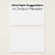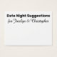 Aqui está um acessório divertido para pegar sua festa de noivado ou chá: cartões de sugestão noturnos de data nos quais os convidados podem escrever notas pessoais para a noiva e o noivo. Na frente, você lê "Sugestões da Noite de Data" em uma fonte ousada, sans-serif; esta fonte é editável para que você possa escolher outra, se preferir... ou até escrever uma mensagem diferente. Abaixo há um lugar para seus nomes; eles aparecem em um roteiro bonito que também é fácil de mudar. Altere o fundo para qualquer cor que você preferir!. Por favor, não hesite em contactar-me se tiver pedidos especiais ou necessitar de outros pontos. Também me apraz ajudar na personalização destes cartões, se for necessário. //