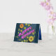 Este cartão de aniversário alegre apresenta um fundo azul brilhante decorado com flores e estrelas de amarelo-sol. A mensagem na frente lê "Parabéns" em fontes rosa brilhante com estrelas ouros. Na dentro do cartão com um vaso de flores coloridas sobre fundo azul. O cartão diz: "Desejando um dia cheio de amor, alegria e todas as suas coisas favoritas. Feliz aniversário!"