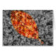 A selectively colored autumn photograph of fallen crepe myrtle leaves, with a gold-framed leaf shape of bright red, orange, and yellow against a black and white background.