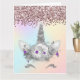 Um cartão de aniversário de unicórnio bonito com um padrão de brilho cor-de-rosa descendo de cima com uma linda e brilhante face de unicórnio prateado embaixo. O unicórnio tem uma espumante buzina prateada, joias prateadas e joias roxas na sua cabeça, e pestanas cintilantes prateadas.