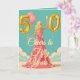 Saúde a um marco ouro! Este cartão de aniversário de 50 anos mostra uma na moda em um vestido cor-de-rosa fluente, criando um copo para a ocasião. O design é acentuado com grandes balões ouros '5' e '0'. O texto na frente, "Saúde a Cinquenta Anos!", é completamente personalizável, assim como a mensagem dentro.