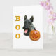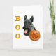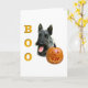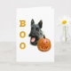 Sua raça de cachorro do AKC Scottish Terrier diz Feliz Halloween com um BOO! Trate alguém para um presente de Terrier escocês revestido com brindle de Halloween!