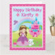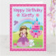 Brunette Purple Dress Princess design com um gato branco, castelo e arco-íris com flores de primavera em fundo bolinhas rosa