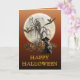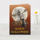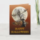 Uma lua grande e pálida com uma árvore assustadora, dois morcegos voando sobre isso, e uma linda bruxa de anime segurando um gato. Cartão de saudação de Halloween único e totalmente personalizável!