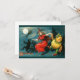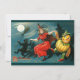 Um belo convite vintage de Halloween, com uma bruxa dançando com um gato e uma personagem de abóbora debaixo da lua.