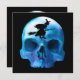 Uma bruxa está voando sobre um crânio azul