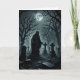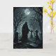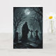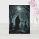 Um espectro negro está em pé sobre uma lápide, em um cemitério sob uma lua cheia, neste cartão assustador de Halloween.