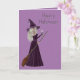 Feliz Cartão de Saudação do Dia das Bruxas com uma bonito bruxa roxa, vassoura e uma vela num fundo de textura roxa. Dentro também foi projetado!