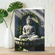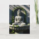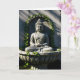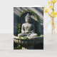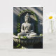 Um cartão de boas-vindas com um cobrir frontal de uma fonte Buda, com camisa e iluminação bonito. Dentro é uma citação de Buda.
