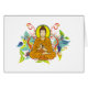 Buddha em Dharma Chakra Mudra senta-se entre um fundo floral colorido bonito! A meditação feliz e as cores reconfortantes criam um design de relaxamento do budismo! T-shirt e presentes originais do budismo!