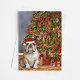 Este cartão de Natal apresenta um retrato de aquarela de um buldogue vestindo um chapéu de Papai Noel sentado debaixo de uma árvore de Natal.