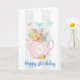 Um cartão de cumprimentos de aniversário com uma ilustração caprichosa. Um bule cor-de-rosa com um pequeno coração cor-de-rosa no centro e um buquê de flores. Delicar borboletas coloridas com sabor a flecha. Colocado sobre uma cinza e fundo listrado branco.