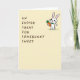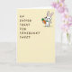 This card shows a white cartoon rabbit in the upper right, drawn with simple lines and tall upright ears with soft pink inner details 🐰. Its tiny black dot eyes and small pink nose give it a gentle, affectionate look, as if it’s shyly offering a treat to someone special. A green bow tie sits neatly at its neck, adding a sweet, friendly touch, and the rabbit holds an orange carrot with leafy green tops like a small gift. Along the left side, the message runs in a vertical layout in brown lettering that feels casual and warm. The text reads, “AN EASTER TREAT FOR SOMEBUNNY SWEET,” with the words stacked to guide your eye from top to bottom 🌷. The background is a uniform pale yellow, like early spring light, leaving plenty of open space so the rabbit and message stand out. The carrot’s bright orange and the bow tie’s green pop against the pale yellow field near the rabbit’s paws.