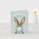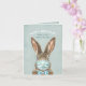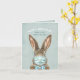 Deseje aos seus amigos e família um feliz aniversário a uma distância social segura! O cobrir desta placa dobrada apresenta um coelho colorido de água com um arco de gravata, vestindo uma máscara médica de proteção. As palavras "Hoppy Birthday a uma distância social segura" são escritas em todos os bonés no topo do cartão. O fundo na frente e dentro deste cartão é um ovo de pinto azul.
