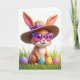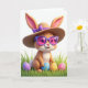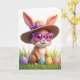 Designed with a glossy, bunny-like character sitting front and center in a spring-green patch of grass 🐰. Behind it, the grass softens into a bright white backdrop that keeps the focus on the character and its friendly, slightly flirty smile. It wears a wide-brimmed warm-toned hat with rose-tinted inner ears peeking out, finished with a small lavender bow that feels like a sweet gift from a close friend. Violet-framed sunglasses with shiny magenta lenses cover its eyes, adding a cool, affectionate “I’m here with you” attitude without showing the full gaze 🐇. Around the bunny, colorful egg-shaped decorations rest in the grass—purple, yellow, and pink—dotted and patterned with tiny flowers like little notes exchanged on a sunny day. In one paw, it gently holds a speckled blue egg shape, angled as if offering it to someone just outside the frame. The greeting text can be placed at the top in soft lavender, with a smaller line near the bottom in light pink, and the scene is lit evenly so the green blades of grass and pastel patterns stay crisp against the white background.