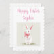 Personalizar com o nome do destinatário. Um coelho branco de Páscoa com um arco rosa giro num cartão dobrado. Excelente para crianças e estilos femininos.