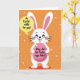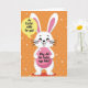 Designed with a cheerful, modern illustration style, this card features an upright white bunny 🐰 centered on a warm orange background dotted with small soft-white spots. Pink accents fill the long ears and warm the cheeks, while a wide smile and a friendly wink create a flirty, buddy-like connection with the viewer. Thin black whiskers and simple facial lines keep the look smooth and easy to read. The bunny hugs a large pastel-pink oval shape at chest level, like a sweet gift being offered with a knowing grin. Above the head, a rounded yellow speech bubble holds the main text in dark lettering, placed high and slightly to one side for balance. Additional smaller text sits on the pink oval in a darker contrasting color, reading clearly against the light surface 🌷. The orange field, white polka dots, yellow bubble, and pastel-pink oval form the full scene with the bunny standing front and center.