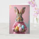 This design shows an upright rabbit-like character centered on a soft gradient background that shifts from pastel pink into muted blue, with gentle, diffused lighting that makes the fur look plush and touchable 🐰. The character wears a pale pink turtleneck sweater with fine knit texture, and its slightly tilted head and steady gaze create a tender, friendly connection with the viewer. In its furry paws, it cradles three smooth egg-shaped objects like treasured gifts, held close as if being offered with quiet affection 🌷. The eggs are colored goldenrod, soft pink, and light blue, each finished with tiny gold speckles that catch the light. Large, dark, reflective eyes and softly shaded ears add warmth, while the background stays uncluttered so the gentle pose reads like a small act of care. Any text would sit neatly near the top in a light cream or soft gold tone, with a smaller line near the bottom in pale pink to balance the colors. Behind the character, faint golden dots float on the pink side and hazy blue circles drift on the blue side.
