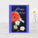 Margarida alaranjada do gerbera da fotografia original e flores amarelas no fundo azul. "O feliz aniversario, desejando lhe todas as coisas bonitas na vida que você merece" a fotografia por Maria Santos (Lusinhas faz Sul)