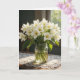 Flores de trílio branco em uma jarra de vidro banhadas em luz suave sobre uma mesa de madeira com um rendado de crochê