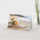 Buquê de laranja e noiva branca num pedaço de madeira derivada numa praia com fundo oceânico. Todo o texto pode ser alterado.