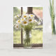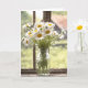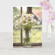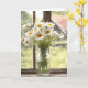 Buquê de margarida branca em janela velha de madeira com vista de fazenda para o aniversário. O texto é editável.
