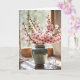 Um buquê florescente de cereja cor-de-rosa num vaso vintage por uma solarenga janela de uma fazenda. Todo o texto pode ser alterado.