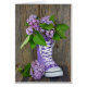 Buquê lilac em um tênis alto roxo em madeira de celeiro rústico.