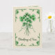 Bonito buquê de Shamrocks amarrados com fita correspondente. O shamrock é símbolo de sorte e da Irlanda. Ornamentado Shamrock. Correspondência entre postagem e roupa.