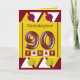 Cartão de cumprimentos de 90. 90 hoje, adicione um nome e escreva o dentro de mensagem. Borgonha e amarelo, vermelho com forma e triângulos de boné de garrafa. Feliz aniversário.