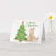 Este cartão de Natal personalizável tem um adorável doggo que está enrolado em luzes sentadas ao lado de uma árvore de Natal, sob neve em queda. As palavras "Feliz Natal" estão acima do cão.
