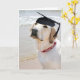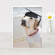 Labrador recupera vestindo um boné de formatura negro na praia.