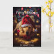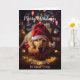 Nome ou mensagem personalizados. Cachorro adorável com chapéu de Natal debaixo da árvore.