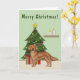 Deseje Feliz Natal aos seus amigos e família com a ajuda deste festivo design do tema cão que mostra a ilustração original de Destei de um lindo cão da raça Retriever Ouro de cor vermelha. O cachorro está parado por uma árvore festiva de Natal decorada com ornamentos vermelhos e amarelos, uma pérola branca e uma estrela amarela que é colocada no topo da árvore. Há também dois presentes embrulhados pela árvore. A cor do chão é bege e a cor da parede de fundo é verde-claro. Há também uma área de texto personalizável que agora diz: "Feliz Natal!".