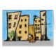 Cachorro marrom com olhos grandes, colarinho vermelho e um dente amarelado pendurado na cidade grande. Arte digital de aquarela original de Taylor Addams.