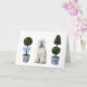 Estas placas de saudação apresentam um retrato de aquarela de um poodle branco padrão sentado entre dois topiários do estilo chinoiserie.