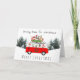 Um doce cartão de natal de cão de aquarela. Num fundo branco, o texto da tipografia diz "Dirigindo para casa para o natal", seguido de Feliz Natal. Um grupo de cães, incluindo um cãozinho, cãozinho, dalmata, labrador, vestindo chapéus e saltadores de natal, é visto voltando para casa para o natal em uma van vermelha de camper, com um Papai noel de trenó no topo contendo ainda mais cachorros com um saco de presentes de natal.