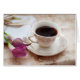 Taça cheia de café sentada sobre um pires com lírios e guardanapos cor-de-rosa