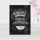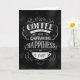 Esta carta dobrada contém uma inscrição manuscular que diz "Café com Amigo é como Capturar Felicidade em uma Copa" em um fundo preto. A inscrição apresenta traços decorativos e espirais ornamentais.